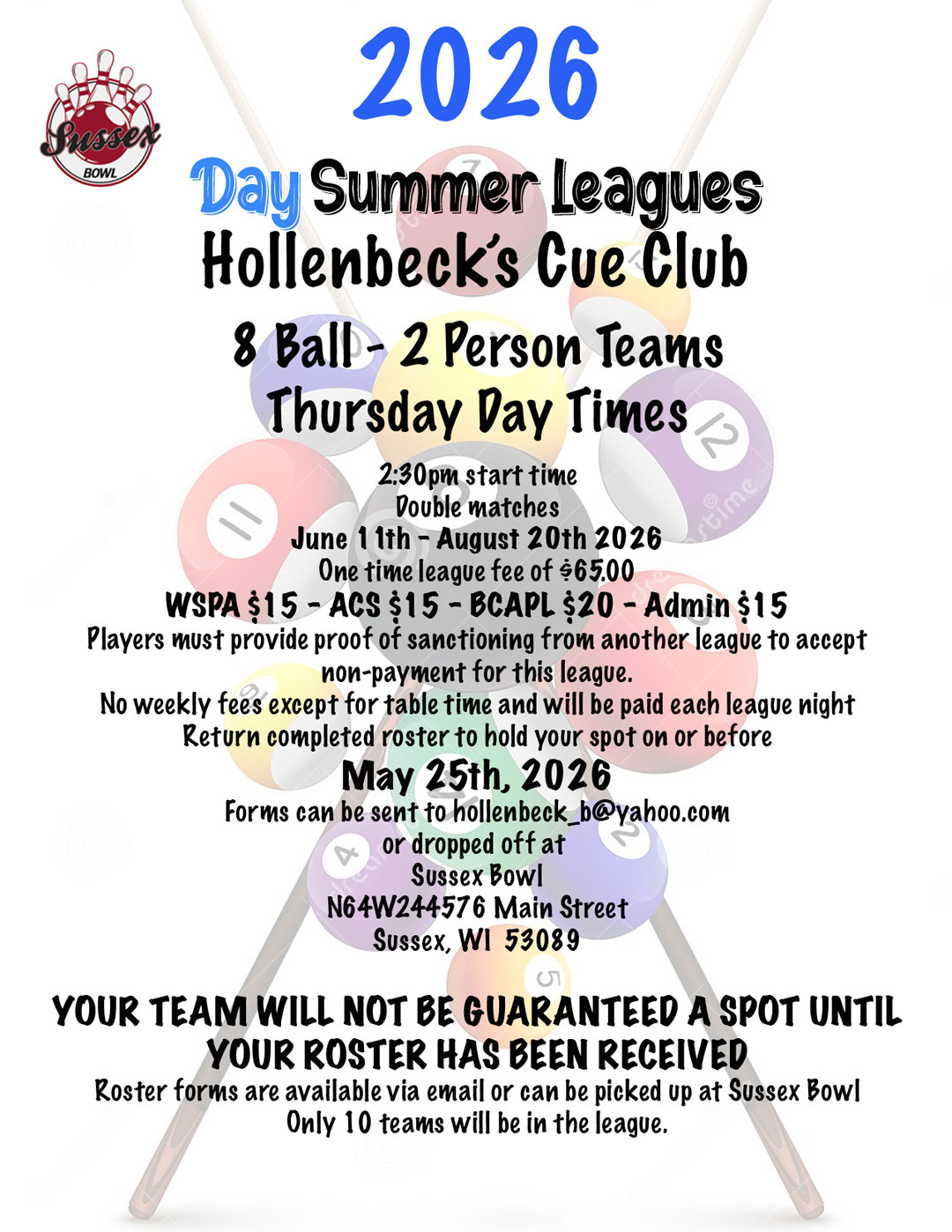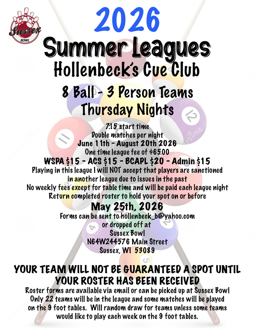 | Thursdays | 2025 Pool Fall Leagues Player meeting: Wed. Sep. 3, 2025, 7:00pm. Leagues start Sep. 18, 7:00pm. See the Thursday Nights League flyer for more info! |